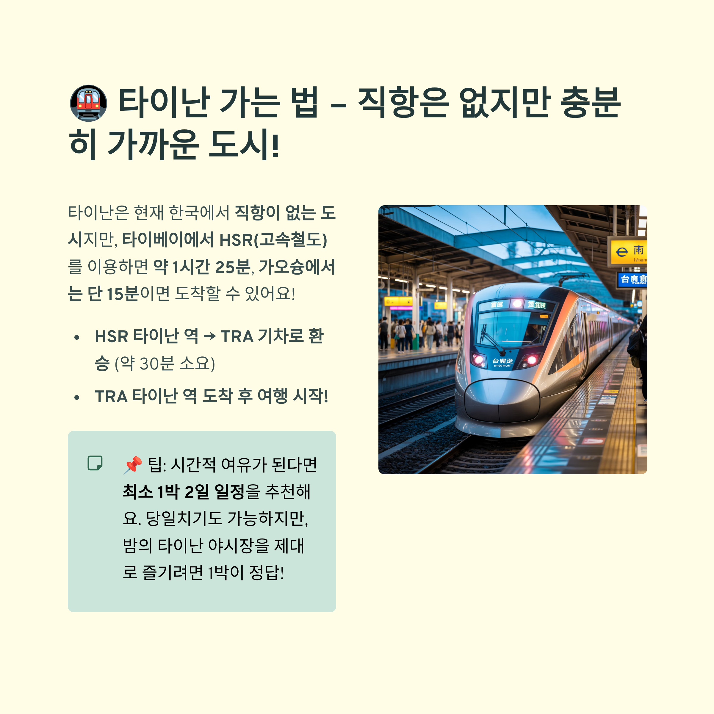 타이난은 현재 한국에서 직항이 없는 도시지만, 생각보다 가까운 도시에요! 타이베이에서 HSR(고속철도)을 타면 약 1시간 25분이면 도착하고, 가오슝에서는 단 15분이면 갈 수 있어요. 고속철도 타이난 역에 도착한 후에는 일반기차인 TRA를 타고 타이난 중심역까지 환승하면 되는데, 대략 30분 정도 더 걸려요. 교통 자체는 전혀 어렵지 않아서 초보 여행자분들도 걱정 없이 이동하실 수 있어요.