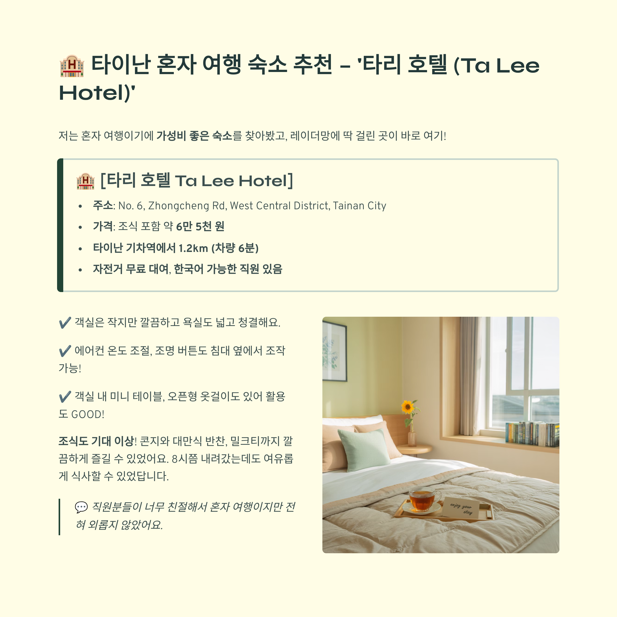 혼자여도 전혀 불편하거나 외롭지 않았던 타이난 여행을 다시 정리해보면, 다음과 같은 포인트로 요약할 수 있어요: