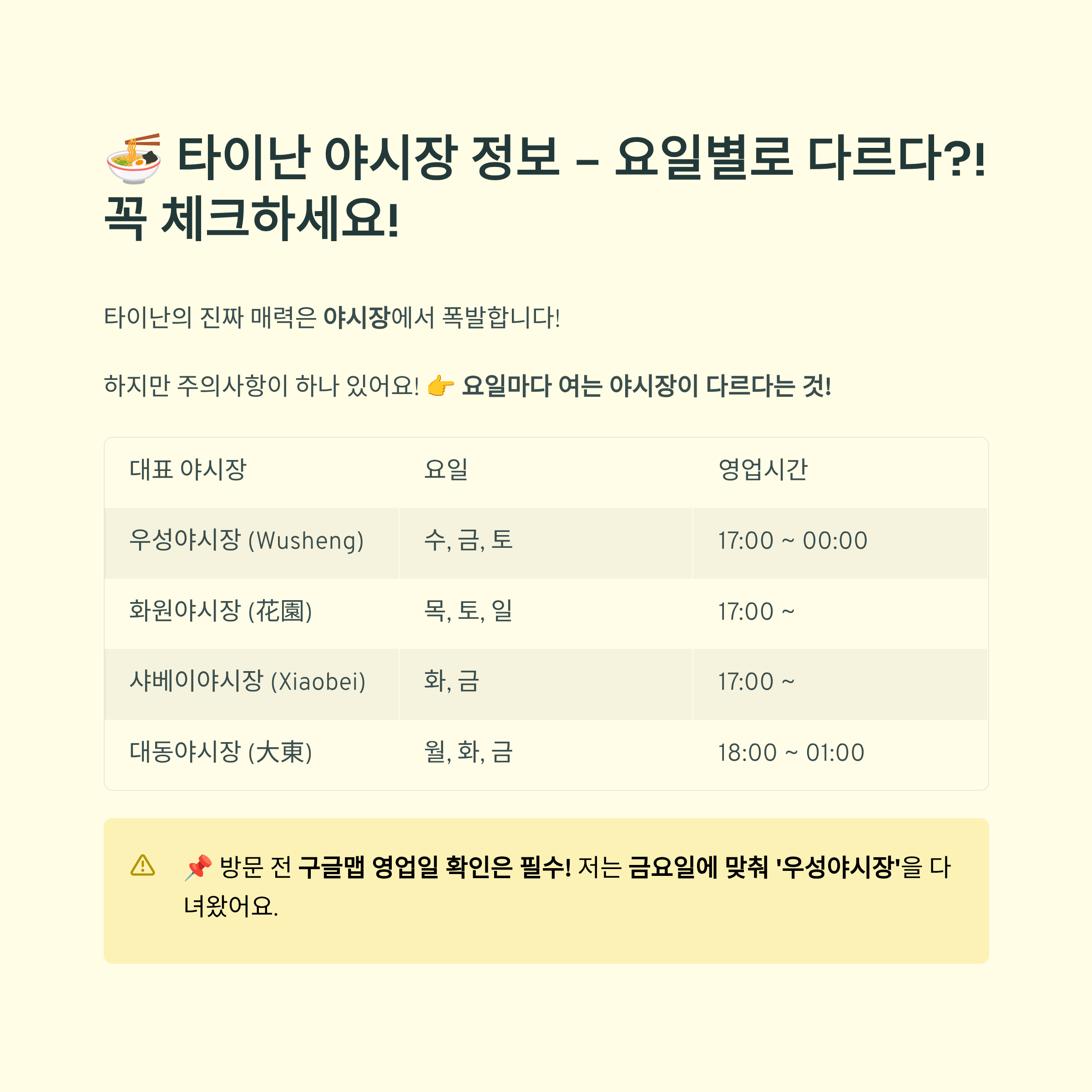타이난의 야시장들은 매일 열리는 게 아니라 요일별로 운영되는 게 달라요. 그래서 방문 전에 꼭 체크해봐야 해요! 아래는 요일별 대표 야시장 리스트입니다: