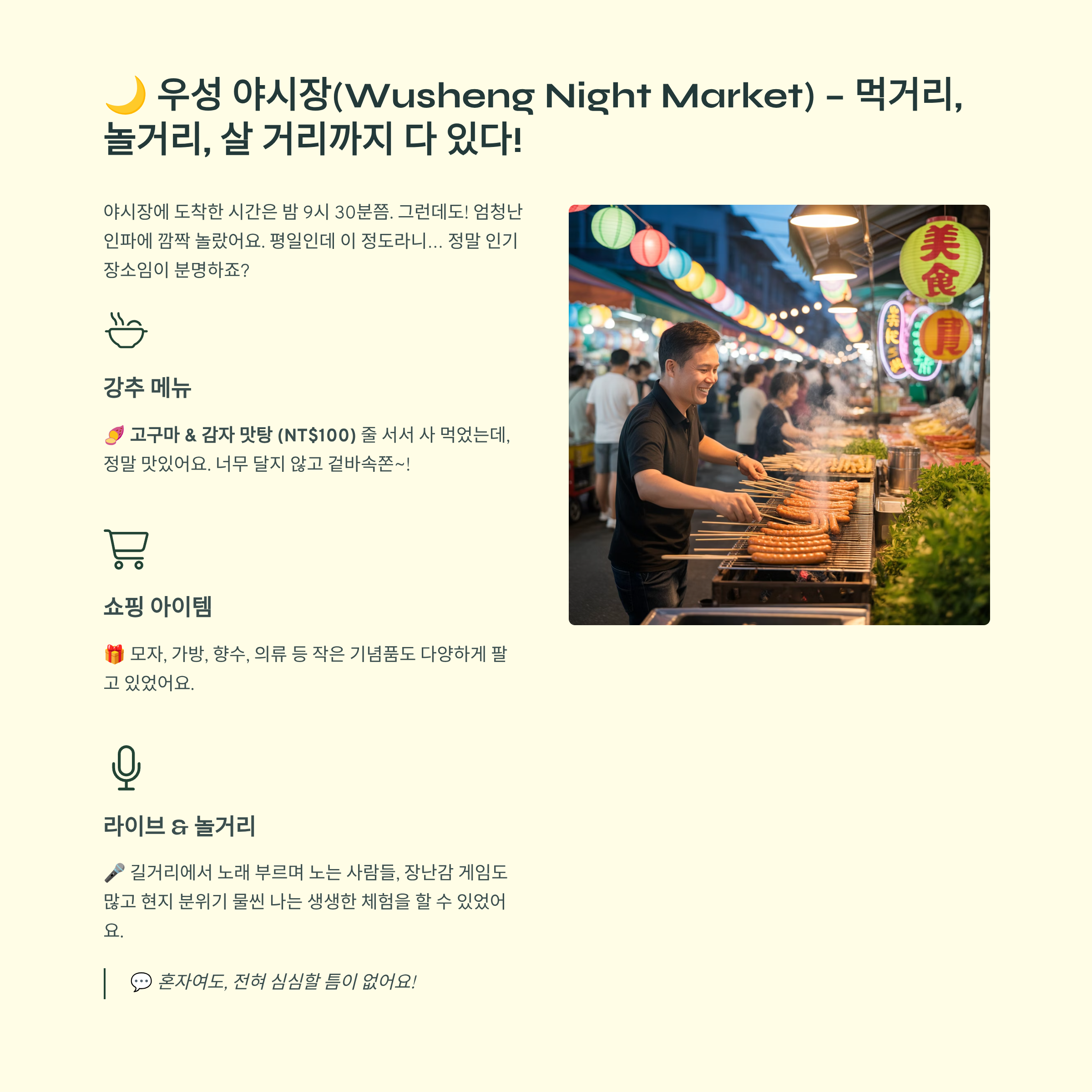 우성 야시장(Wusheng) – 먹거리, 놀거리, 쇼핑까지!