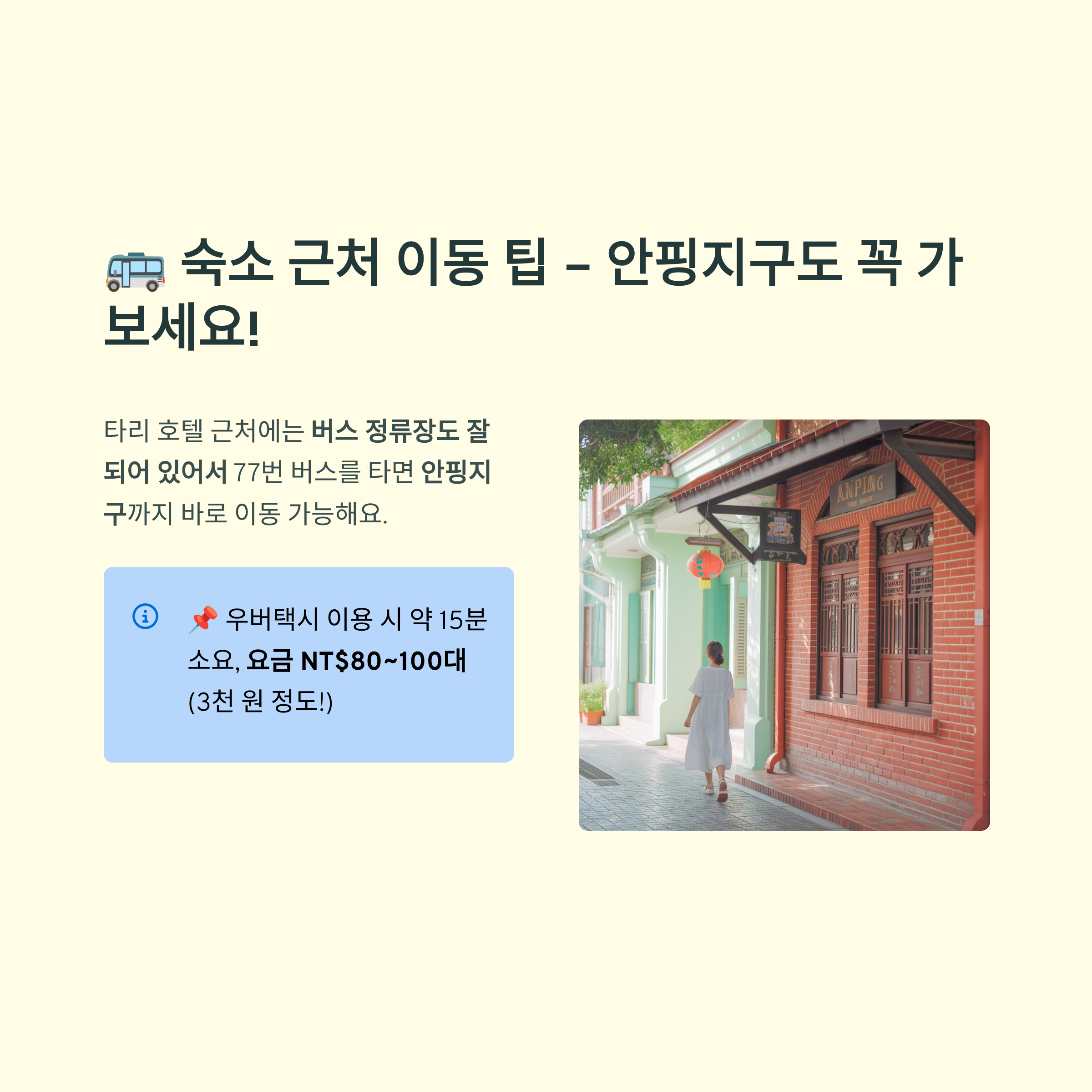 숙소 근처에서 바로 탈 수 있는 버스가 있어 이동도 편했고, 우버는 워낙 저렴해서 부담 없이 이용 가능했어요. 안핑지구는 꼭 들러보시길 추천해요! 역사적인 분위기와 레트로 감성, 전통 간식까지 즐길 수 있어요.