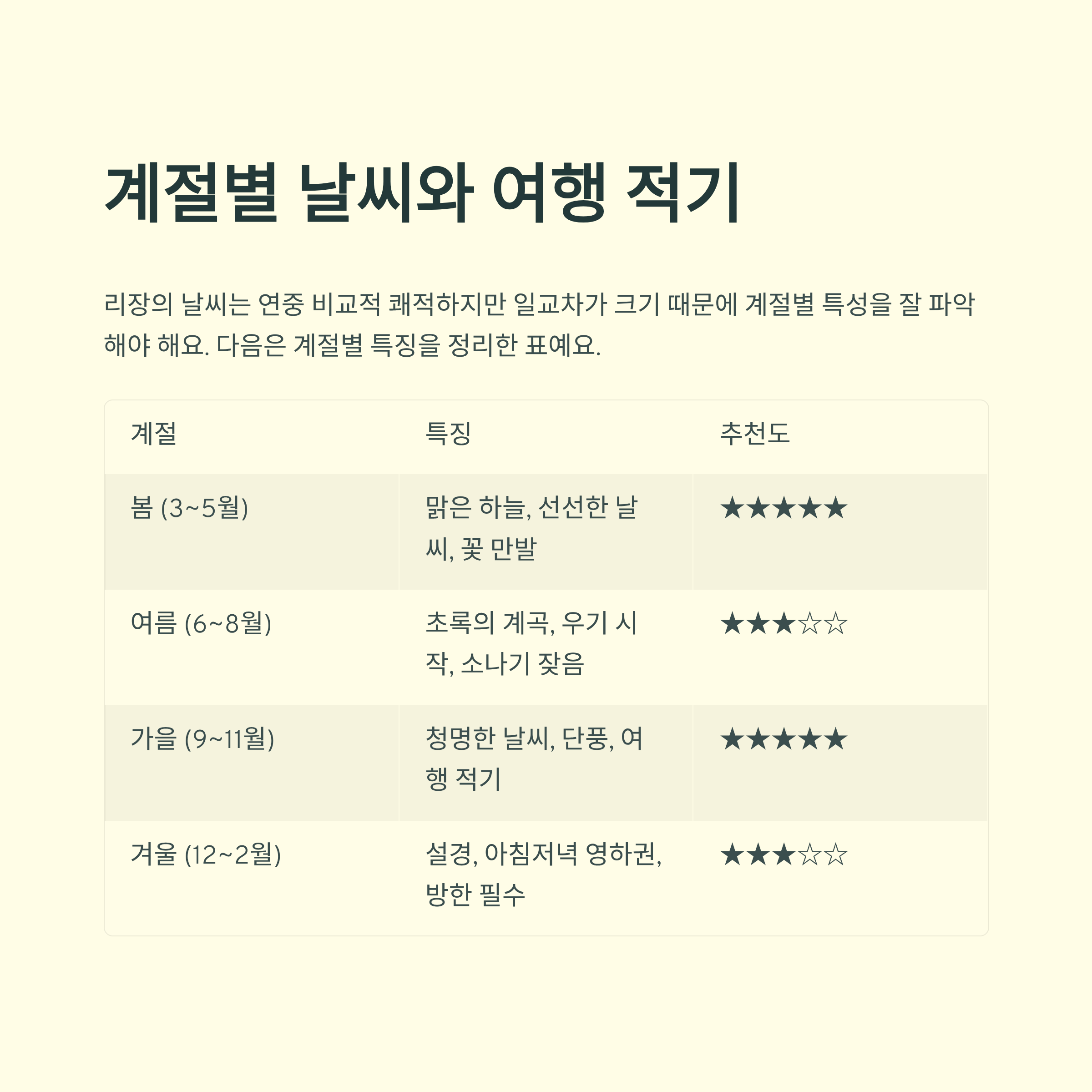 리장의 날씨는 연중 비교적 쾌적하지만 일교차가 크기 때문에 계절별 특성을 잘 파악해야 해요. 다음은 계절별 특징을 정리한 표예요.