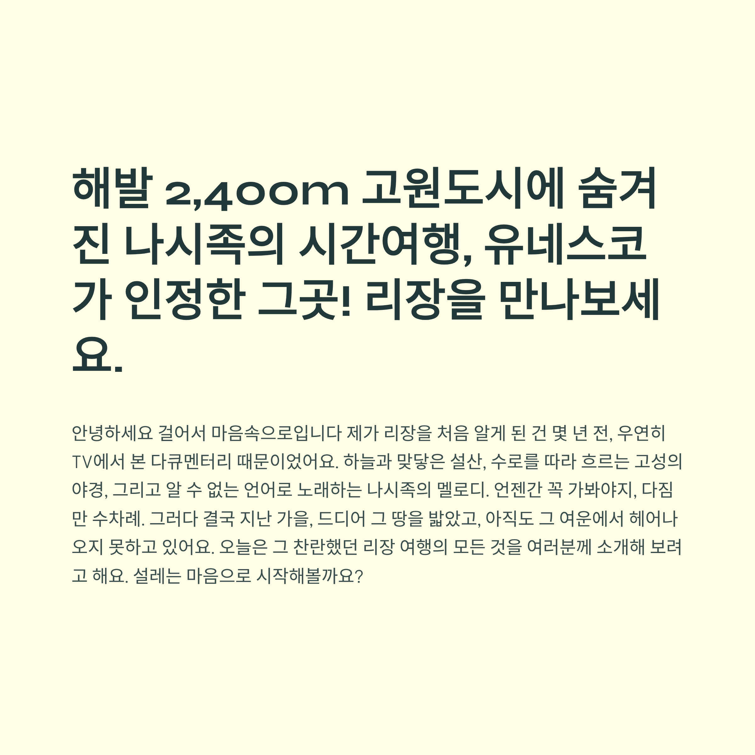 안녕하세요 걸어서 마음속으로입니다 제가 리장을 처음 알게 된 건 몇 년 전, 우연히 TV에서 본 다큐멘터리 때문이었어요. 하늘과 맞닿은 설산, 수로를 따라 흐르는 고성의 야경, 그리고 알 수 없는 언어로 노래하는 나시족의 멜로디. 언젠간 꼭 가봐야지, 다짐만 수차례. 그러다 결국 지난 가을, 드디어 그 땅을 밟았고, 아직도 그 여운에서 헤어나오지 못하고 있어요. 오늘은 그 찬란했던 리장 여행의 모든 것을 여러분께 소개해 보려고 해요. 설레는 마음으로 시작해볼까요?