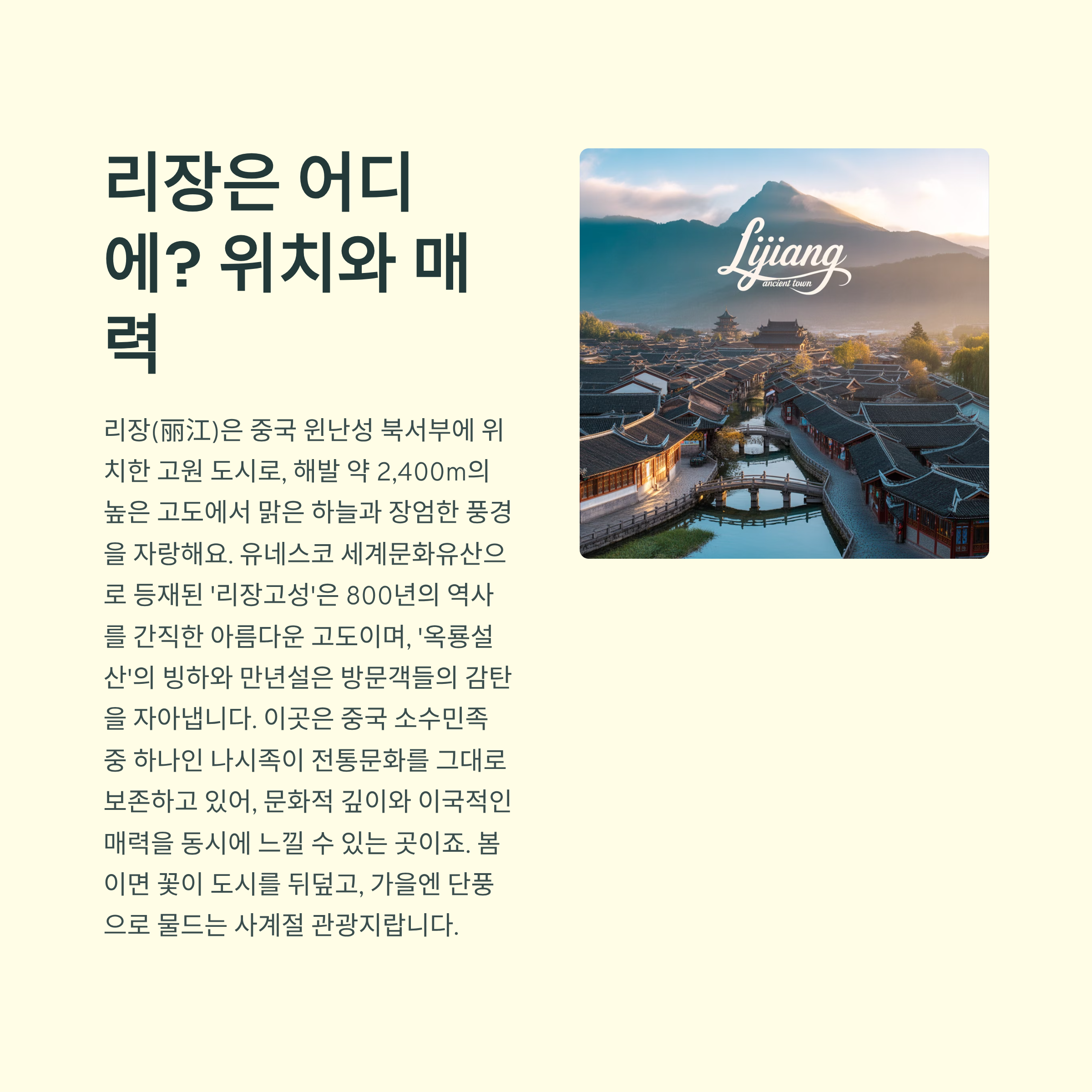 해발 2,400m 고원도시에 숨겨진 나시족의 시간여행, 유네스코가 인정한 그곳! 리장을 만나보세요.