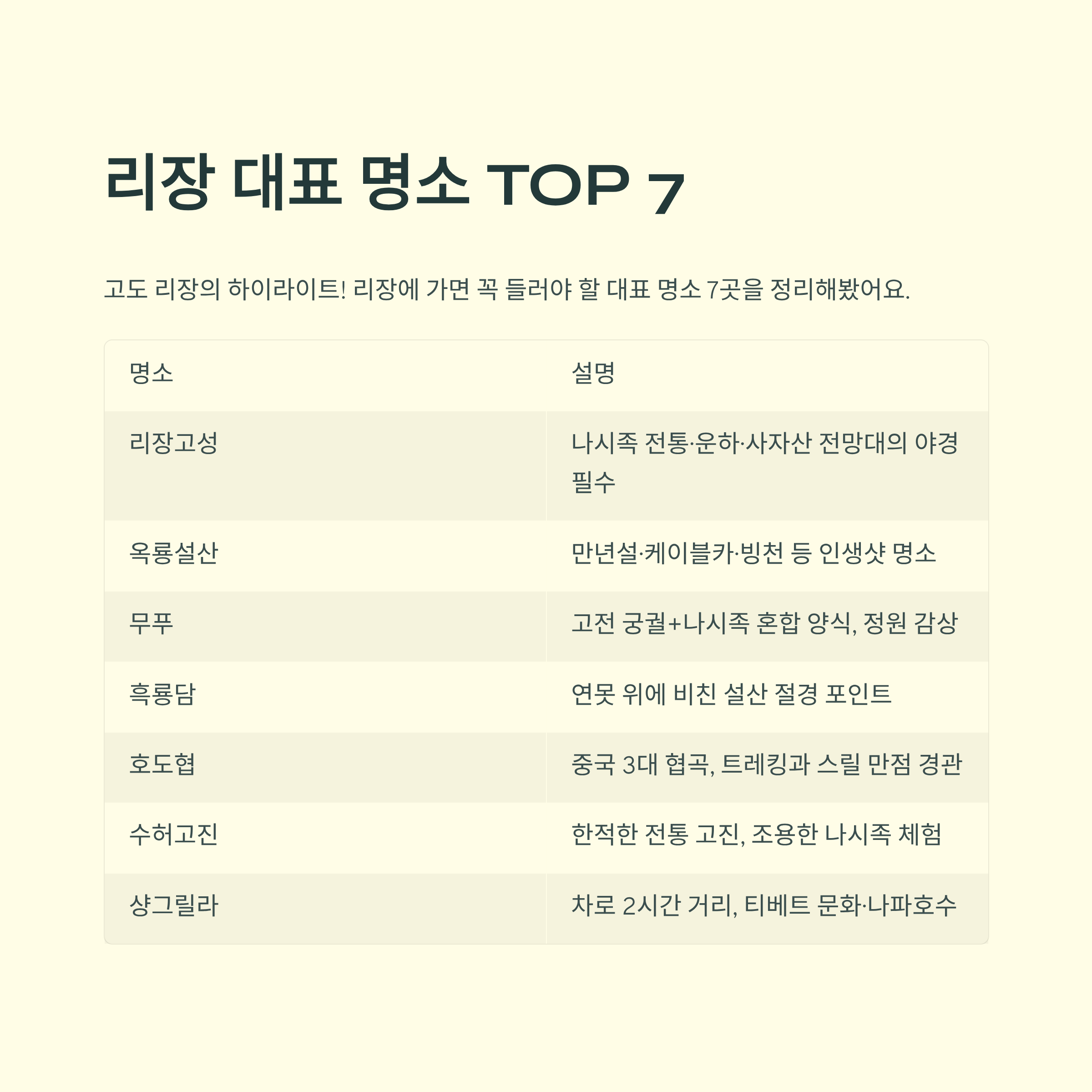 고도 리장의 하이라이트! 리장에 가면 꼭 들러야 할 대표 명소 7곳을 정리해봤어요.