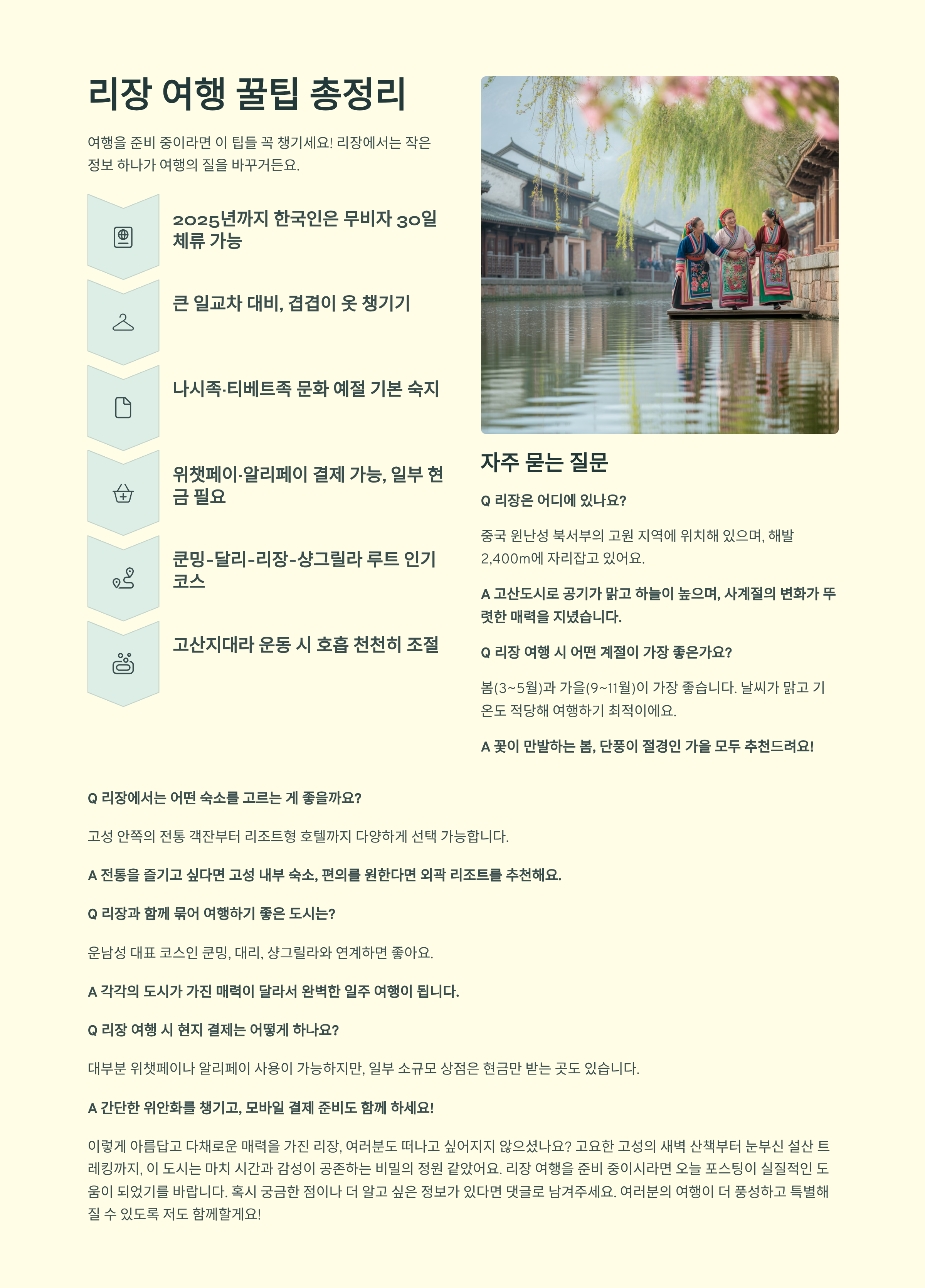 여행을 준비 중이라면 이 팁들 꼭 챙기세요! 리장에서는 작은 정보 하나가 여행의 질을 바꾸거든요.
